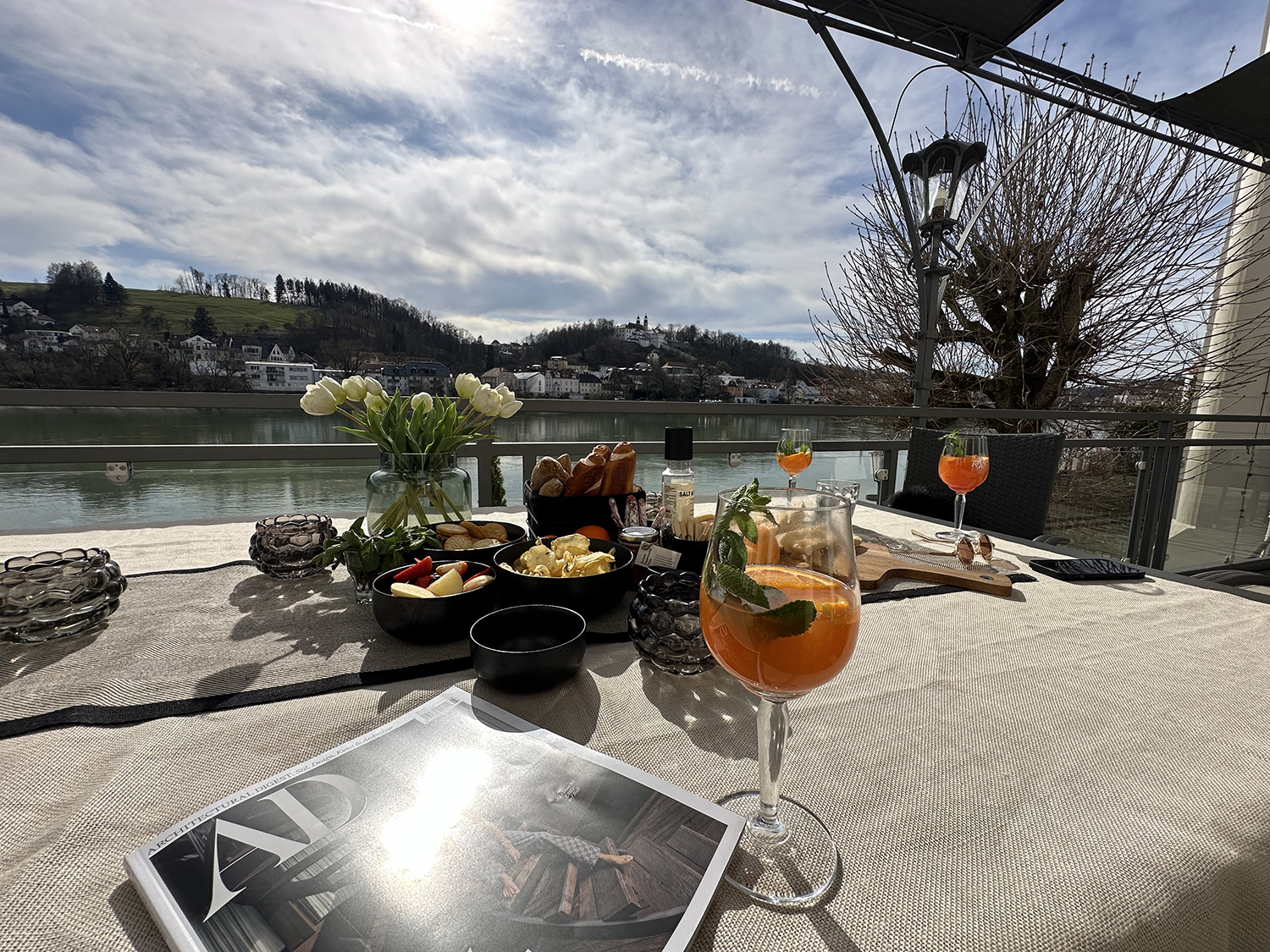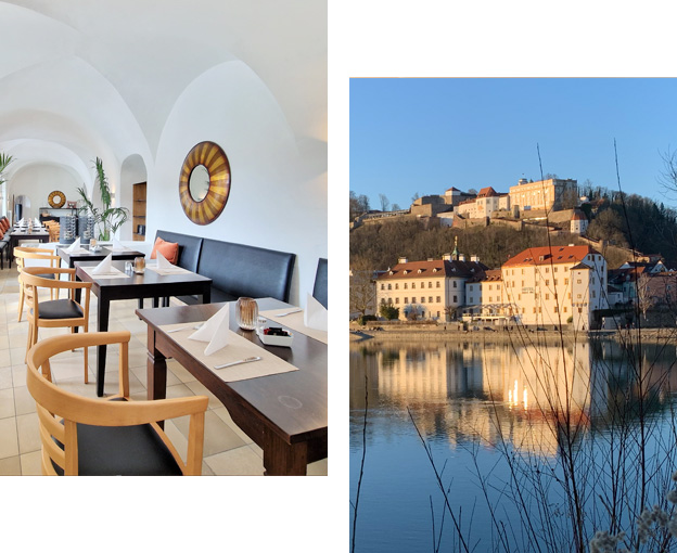 Alle Sehenswürdigkeiten der bezaubernden Stadt erreichen Sie bequem zu Fuß. Sie haben direkten Anschluss an die Kais der Donauschifffahrt und können bequem Ihre Ausflüge von uns aus starten. Oder Sie lassen die Seele einfach auf unserer Sonnenterrasse direkt am Innufer baumeln und genießen einen feinen Kaffee oder ein Glas Wein.